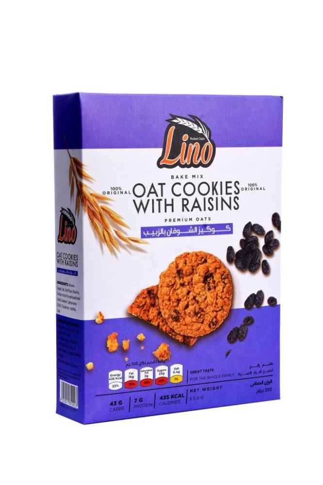 لينو كوكيز الشوفان بالزبيب 350جم، مزيج لذيذ من الطعم الغني والألياف الطبيعية، مثالي كسناك صحي يوميًا.